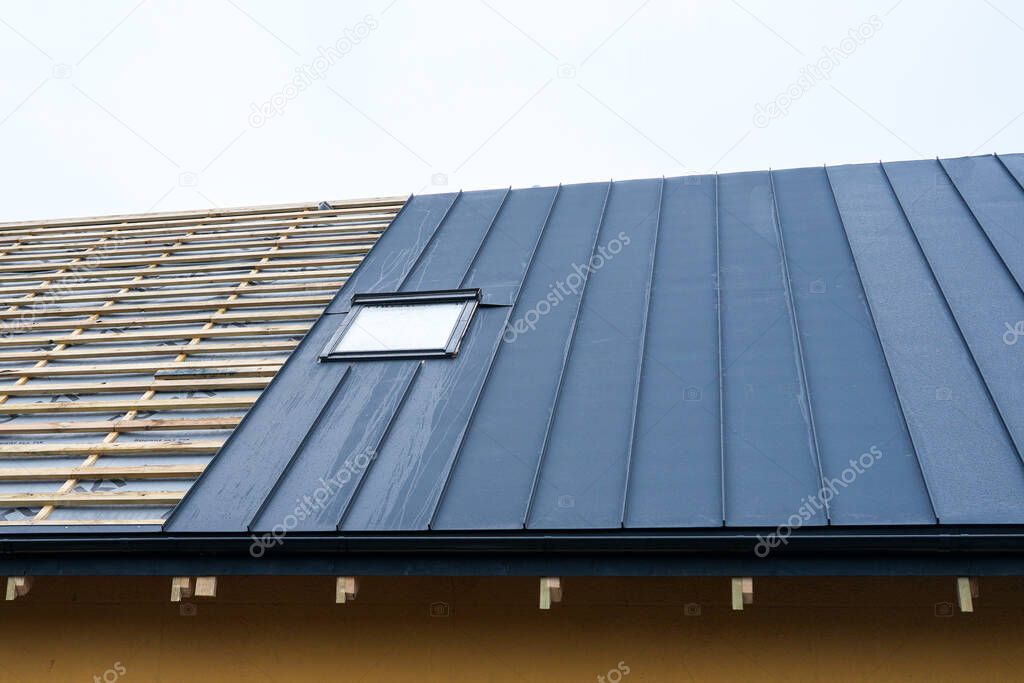 Detail eines Stehfalz-Metalldachs Kamineinfassung mit sauberer Anbindung Montierte Dachrinne mit Fallrohr an Fassade